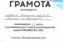 Новая победа коллектива 2 место в муниципальном этапе республиканской акции "Эковесна 2021г. в номинации "Лучший детский сад""/Безнең балалар бакчасы коллективы "Экояз "2021 ел республика акциясендә"Иң яхшы балалар бакчасы" номинациясендә 2 нче урын яулады.ә 15.07.2021
