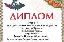 Диплом I степени Республиканского конкурса детского творчества "Читаем Тукая", в номинации "Вокал награждена Галеева Ясмина" 30.04.2021