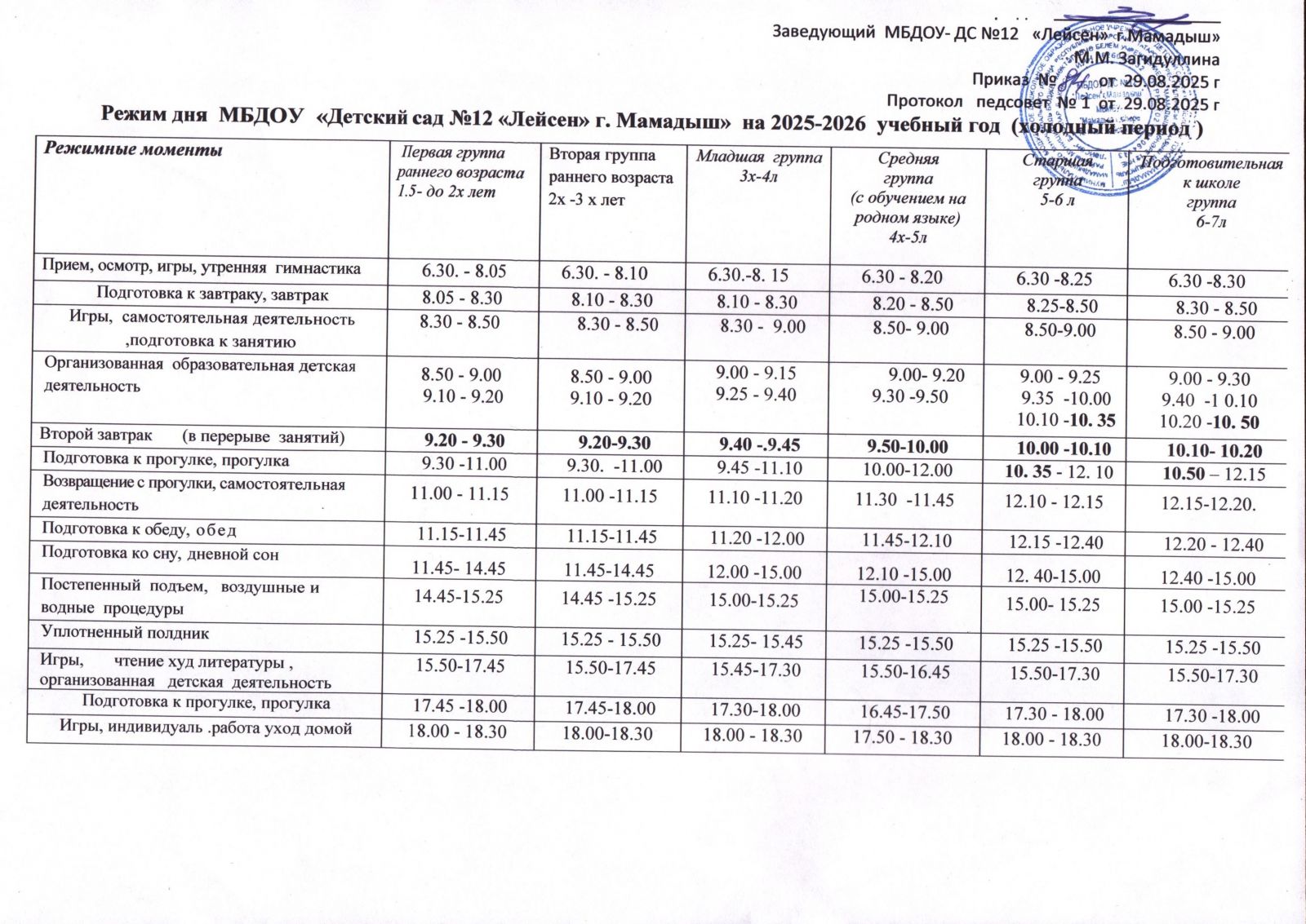 Режим работы детского сада: 5 - ти дневная рабочая неделя; длительность работы детского сада – 12 часов: с 6.30 до 18.30 часов ежедневно, кроме праздничных и выходных - субботы, воскресенья. Основной структурной единицей детского сада является группа детей дошкольного возраста.