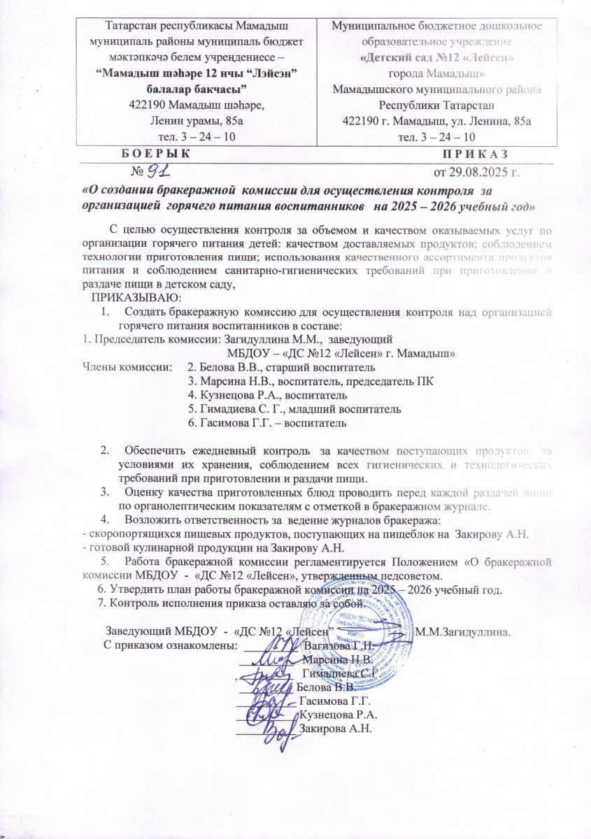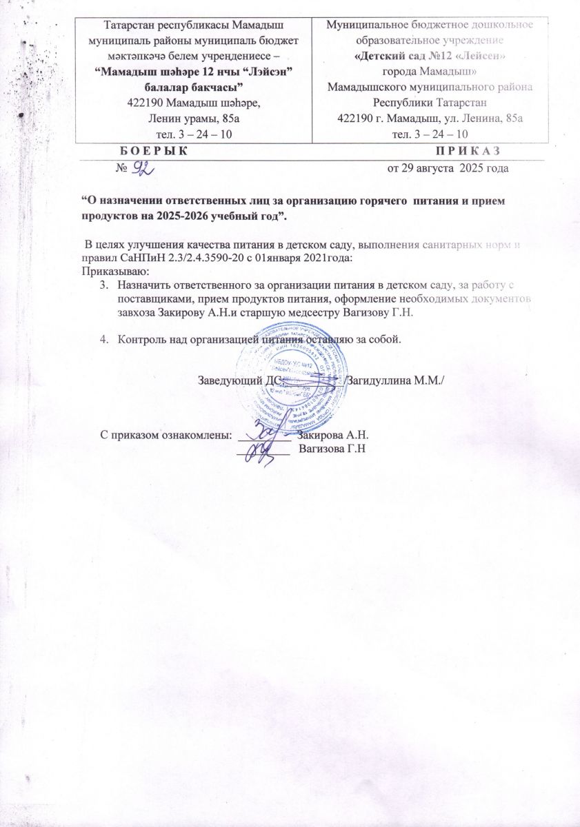 Приказ о назначении ответственного за снятие и хранение суточных проб на 2025-2026 гг