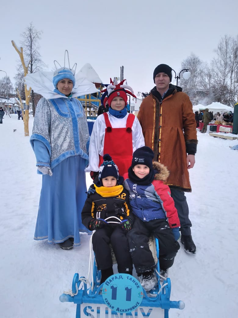 Шестой год подряд в нашем городе проводится фестиваль креативных саней "SUNNYфест" и каждый раз организаторы придумывают что-то новое. Так, нынче привлекли к участию семьи с детьми. В муниципальном семейном конкурсе "Парад санок - Чудо сани" от МБДОУ-"Детский сад №8 "Нухрат" приняла участие семья воспитанника старшей группы Аделя Аскарова - папа, мама и старший брат. В соответствии с условиями конкурса Аскаровы представили на суд компетентного жюри визитку-приветствие "Снежная королева", все одели соответствующие костюмы, а главное, прокатили Аделя, сыгравшего роль Кая, на эксклюзивных кованых санях.