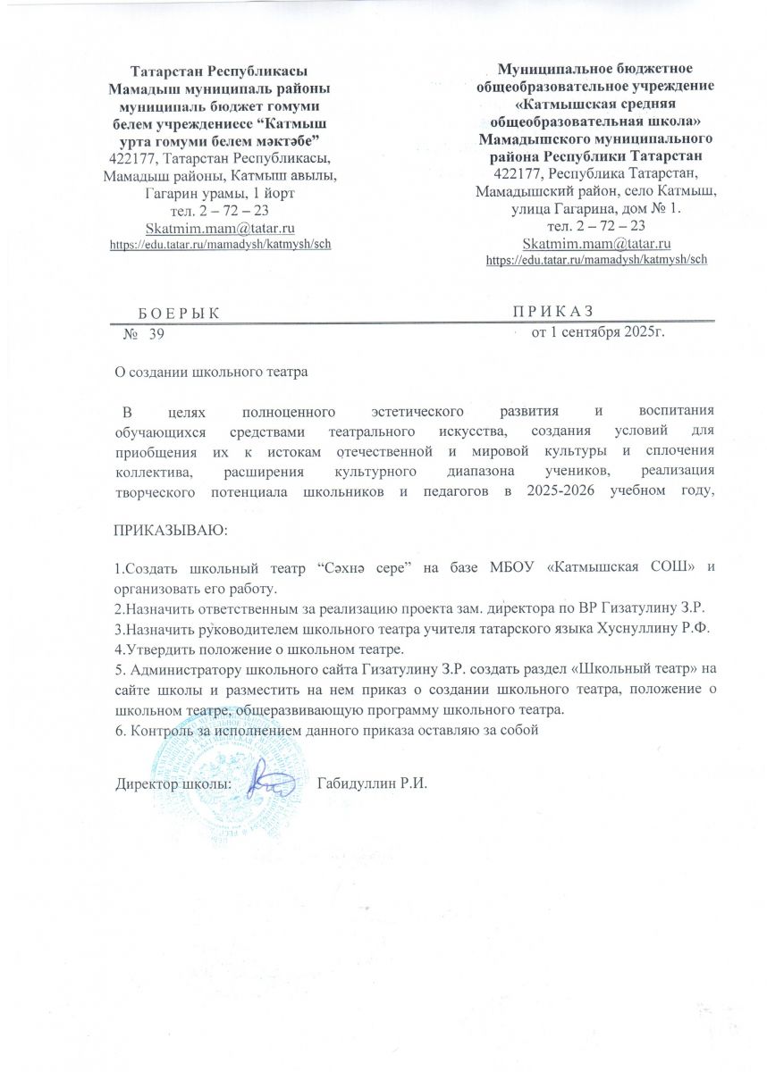 муниципальное бюджетное общеобразовательное учреждение «Катмышская средняя общеобразовательная школа» Мамадышского муниципального района Республики Татарстан/ Татарстан Республикасы Мамадыш муниципаль районы муниципаль бюджет гомуми белем учреждениесе "Катмыш урта гомуми белем мәктәбе"