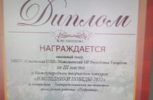 Наш школьный театр принял участие в Международном творческом конкурсе "Наследники Победы-2022" в поминации "Театрализованная постановка" конкурсная работа "Подранки" и были удостоены дипломом за 3 место.