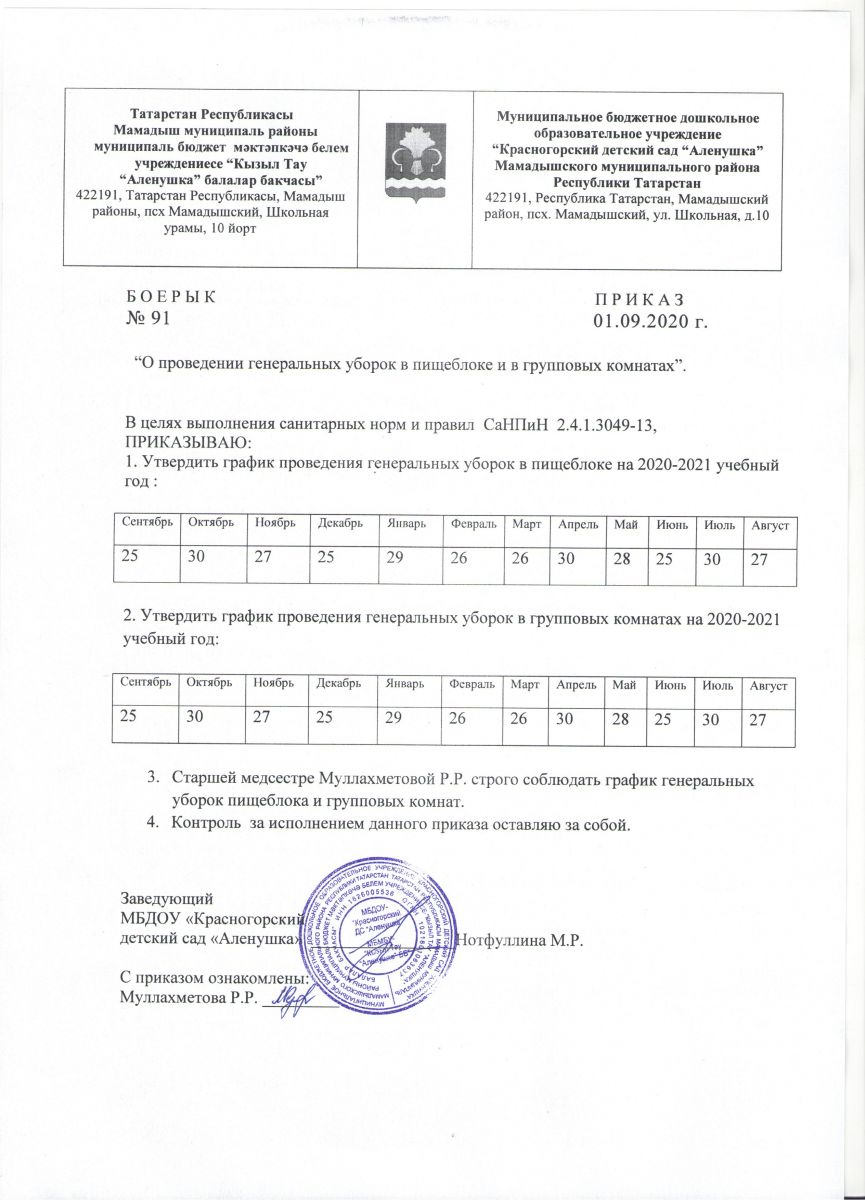 Приказ "О проведении генеральных уборок в пищеблоке и в групповых комнатах"