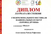 Әхмәтҗанова Рәйхан I төбәкара "Хоровод Дружбы" фестивалендә III дәрәҗә лауреат исеменә лаек булды!Афәрин, Рәйхан!