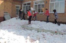Учащиеся 7-8 классов проводят очистку школьной территории от снега