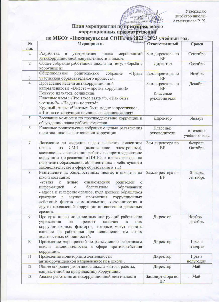 План мероприятий по предупреждению коррупционных правонарушений на 2022-2023 учебный год