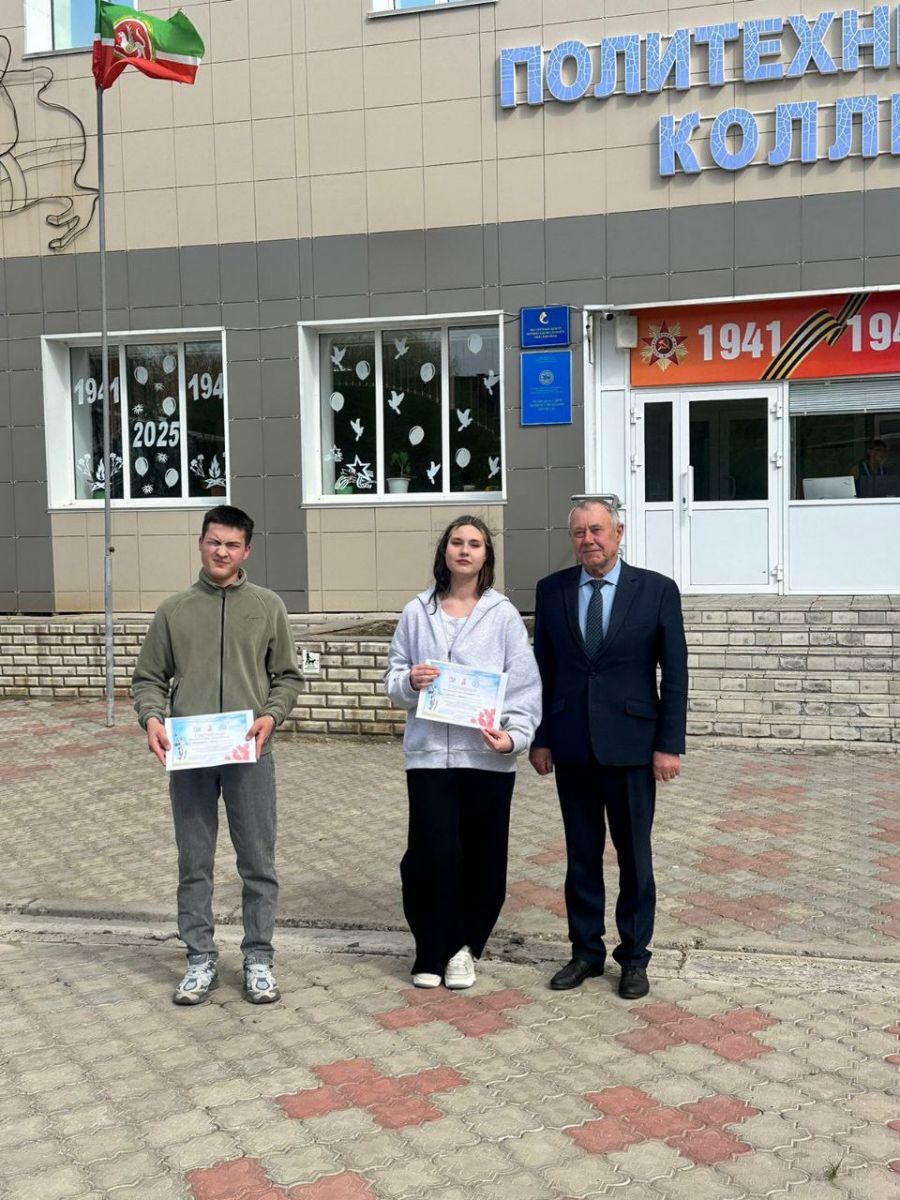 Наши студенты Шамсутдинов Нафис и Нуруллина Камила приняли участие в Республиканском конкурсе исследовательских работ ПОО РТ "И горит огонь вечной памяти...", посвященного 80-летию Победы в Великой Отечественной войне.