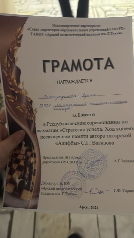 В Республиканских соревнованиях по шахматам "Стратегия успеха. Ход конем" студентка нашего колледжа Фатхутдинова Язиля заняла почетное 1 место.