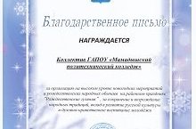 Коллектив ГАПОУ "Мамадышский политехнический колледж" награжден Главой муниципального района А.П. Ивановым благодарственным письмом за организацию на высоком уровне новогодних мероприятий и рождественских народных обычаев на районном празднике "Рождественские гуляния", за сохранение и возрождение народных традиций, вклад в развитие русской культуры и духовно-нравственное воспитание молодежи.