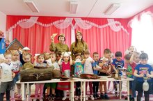 В предверии праздника Дня Победы наш детский сад посетида выездная экспозиция Мамадышского краеведческого музея - "Военный чемодан". Были представлены оружие, боеприпасы, пули, гранаты, форма одежды, головные уборы, офицерский планшет с документами.Выражаем огромную благодарность Давыдовой Гуляндам и Салиховой Гульфие их руководителю Садриевой Минзиле за организацию передвижной экскурсии.