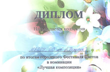Наш коллектив принял участие в городском Фестивале Цветов и награждён дипломом в номинации " Лучшая композиция".