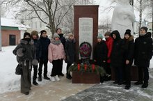 28.11.20 состоялся митинг у памятника «Скорбящей матери». Ученики 10 класса возложили гирлянду к самому памятнику.