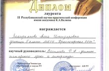 Обучающаяся 5б класса Закирьянова Алия стала лауреатом II Республиканской научно-практической конференции имени академика К.А.Валиева (научный руководитель – Васильева Р.А.).