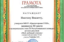 Обучающаяся 2 А класса Инютина Виолетта заняла 3 место в муниципальном этапе III Республиканского конкурса детских рисунков "Мой любимый учитель".