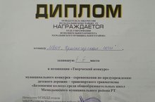 "Безопасное колесо" 23.03.2018 23 марта наша команда ЮИД "Перекресток" приняла участие в муниципальном конкурсе- соревновании по предупреждению ДДТТ "Безопасное колесо". В номинации " Творческий конкурс" заняли 2 место и награждены дипломом.