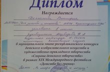 Ученица 8Б класса Дехканова В. заняла I место в муниципальном этапе республиканского конкурса детского изобразительного искусства и художественно-прикладного творчества "Страна детского творчества" в рамках XIX Международного фестиваля "Детство без границ" по теме "В мире мифов и легенд", номинация: вышивание гладью.