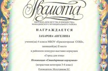 Грамотой МБОУ ДОД "Дом детства и юношества" награждена обучающаяся 4 класса Захарова Ангелина за 2 место в районном конкурсе-выставке кормушек "Город для птиц" в номинации "Стандартная кормушка". Сертификатами за участие в конкурсе кормушек награждены: Хусаинов Альвир 3 А класс, Фазылова Адиля 3 Б класс, Герасимова Кристина 6 А класс, Инютин Владислав 7 А класс.