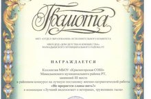 Грамотами МБОУ ДОД "Дом детства и юношества" награжден коллектив МБОУ "Красногорская СОШ" за 2 место в районном конкурсе на лучшую постановку военно-патриотической работы "Не прервется славы нить!" в номинации "Лучшее оформление уголка боевой славы по военно-патриотической тематике" и за 3 место в номинации "Лучший видеосюжет о ветеранах, тружениках тыла".
