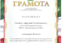 Грамотой МКУ "Отдел образования" награждена учитель начальных классов Ганиева А.С. за 2 место в муниципальном конкурсе методических разработок антикоррупционной направленности среди педагогов.