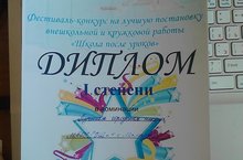 Дипломом 1 степени была награждена наша школа на фестиваль-конкурсе на лучшую постановку внешкольной и кружковой работы "Школа после уроков" в номинации "Лучшая городская школа".