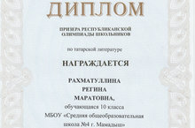 Поздравляем Рахматуллину Регину, ученицу 10а класса, ставшую призером республиканской олимпиады по татарской литературе в русских классах (татарская подгруппа), а также ее наставника учителя татарского языка и литературы Махмутову Гузалию Махмутовну.