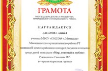 Грамотой МБОУ ДОД "Дом детства и юношества" награждается Ахсанова Алина, ученица 10а класса, занявшая 2 место в районном конкурсе рисунков и поделок среди детей инвалидов "Мир, который я люблю" (руководитель Гимадиева М.Р.). Поздравляем и желаем дальнейших побед!