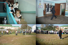 Сегодня в школе состоялась практическая учебная эвакуация, началом для которой послужил сигнал, полученный от сработки автоматической пожарной сигнализации. По легенде организаторов учений, очаг возгорания находился в столовой, где произошло короткое замыкание электропроводки. Создалась угроза распространения огня на учебные классы. Персоналом школы была организована эвакуация учащихся из здания, все ученики и педагоги по сигналу тревоги быстро покинули здание школы. Затем учителя проверили наличие учеников, которые построились перед зданием школы. В ходе переклички выяснилось, что в здании никто не остался, все эвакуировались за положенное нормативное время.
