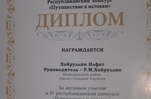 За активное участие в IV республиканском конкурсе "Путешествие к истокам" награждается ученик 6 класса Хайруллин Илфат.
