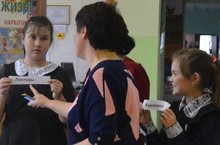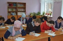Татарча диктант язу. Теләгән һәр кеше өчен мәктәп ишекләре ачык иде. Бүген теләкләрен тормышка ашыру өчен авыл халкы да, мәктәп укучылары һәм укытучылар коллективы да парта артына утырды. Р.Миннуллинның "Мин кулыма китап алам" текстын яздылар.
