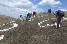 Юнармия әгъзалары тау башына язылган "Җиңүгә 72 ел" язуын акшар белән агарта.