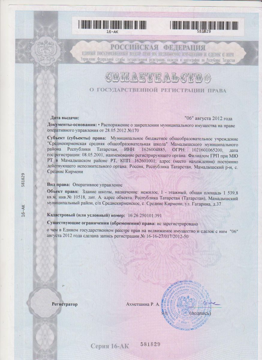 | Адрес: | 422171, Республика Татарстан, Мамадышский район, д. Средние Кирмени, ул. Гагарина, д. 37 |