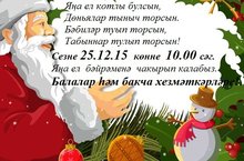 Сезне якынлашып килүче Яңа 2016 нче ел белән нчын күңелдән котлыйбыз! Сезгә исәнлек-саулык, бәхет-шатлык, тыныч тату тормыш телибез. Яңа ел Сезгә бары тик яңадан-яңа уңышлар, бәхет алып килсен. Сезне 25 нчы декабрь көнне Яңа ел тамашасына чакырабыз.