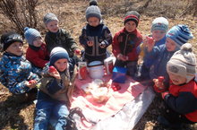 1 нче май бәйрәмен каршы алу уңаеннан, без - балалар белән табигатькә экскурсия оештырабыз. Саф һавада " алтын -кызыл" йомыркалар бигрәк тәмле шул!