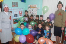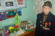 Җиңүнең 70 еллыгын каршылау уңаеннан, "Иҗади сәнгать эшчәнлеге"ндә балалар белән котлау открыткалары ясадык. Былтыр 90 яшен тутырып арабыздан киткән, Сон ягының "Соңгы могиканы" - Ленинград блокадасының эчендә кайнаган беренче группа инвалид, сугыш ветераны - Низамов Гыйльметдин Низам улының шәхси киемнәрен - бигрәк тә орден - медальләрен таккан костюмын киеп карау һәр балада горурлык хисе тудырды.