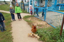 Әкияттәгечә, тавык үзенең чебиләре белән балалар бакчасы янына үзе килгән. Сентябрь аенда "качып" чыгарган чебиләрен безнең балаларыбыз да күреп калсын дигәндер инде.