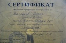 Сертификат МКУ "Отдел образования", МБОУ ДОД "Дом детства и юношества" за активное участие в районном конкурсе-выставке кормушек "Город для птиц" выдан Ситдиковой Лейсан, ученице 9 класса, Гарипову Радилю, ученику 5 класса, Назиповой Дине, ученице 2 класса, Хадиуллину Искандеру, ученику 2 класса . Поздравляем и желаем дальнейших побед!