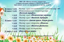 МБУ ДО "Центр детского творчества" приглашает детей на мероприятия и мастер классные в период весенних каникул, которые пройдут с 28 марта по 1 апреля 2022 г.