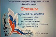 Воспитанники обособленного подразделения МБДОУ «Бизякинский детский сад «Лейсан» с. Сетяково -Богачев Александр, Хисамова Радмила, Грибачева Елена участвовали в Межрегиональном конкурсе патриотической песни «Герои Отечества» и стали Лауреатами Ill степени в номинации «Хор». Дорогие наши воспитанники!!! Поздравляем Вас с победой в конкурсе и желаем новых творческих открытий и значимых наград!