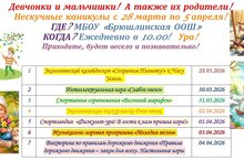 Весенние каникулы — это короткий перерыв в учебном процессе, который помогает школьникам восстановить силы перед заключительной частью учебного года. В этом году каникулы начинаются с 28 марта по 4 апреля! В нашей школе пройдут интересные, увлекательные и познавательные мероприятия! Начало в 10.00 кроме воскресенья!
