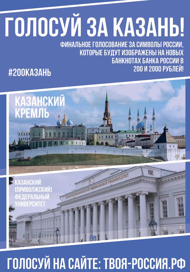 Опубликовано: 19.09.2016Идет второй этап голосования по выбору символов городов России для изображения на новых банкнотах номиналом в 200 и 2 000 рублей. Коллектив детского сада дружно принимает участие в голосовании и просит всех посетителей нашего сайта проголосовать за Казань.