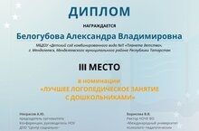Укытучы-логопед А.В. Белогубова «логопедик копилка» Бөтенроссия методик эшләнмәләр конкурсында катнашып, "мәктәпкәчә яшьтәге балалар белән иң яхшы логопедик дәрес"номинациясендә 3 нче урынны алды.