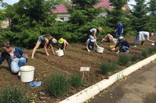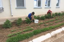 Сегодня отряд трудового лагеря убирался на пришкольном участке: пропалывал грядки, поливал цветы, убирал мусор, рассаживали цветы...