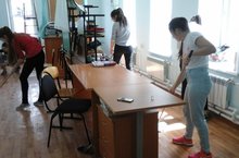 Сегодня ребята работали внутри здания школы: поливали цветы, мыли полы, переносили стулья, столы...