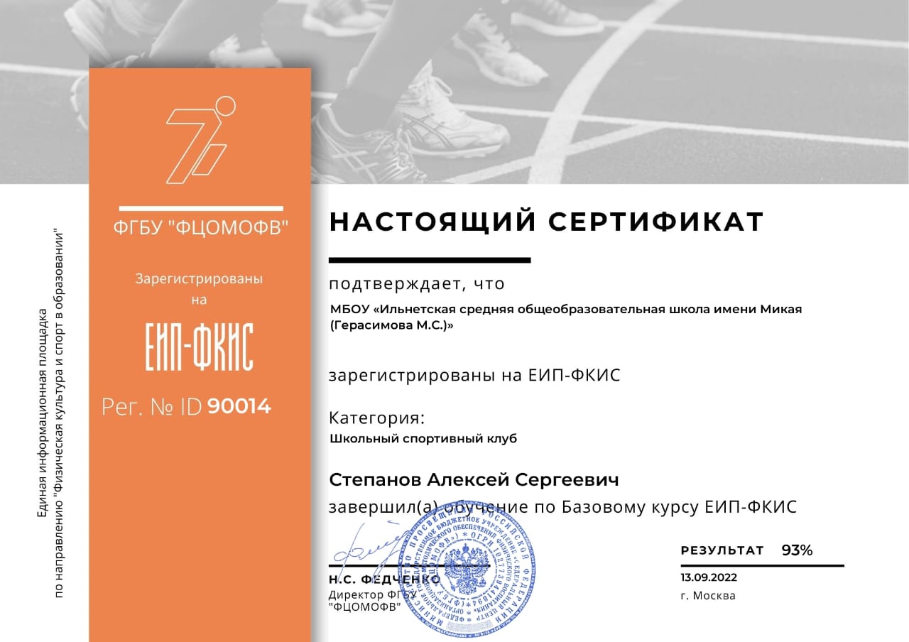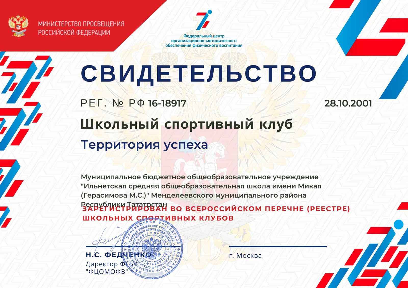 Свидетельство о регистрации во Всероссийском перечне(реестре) ШСК