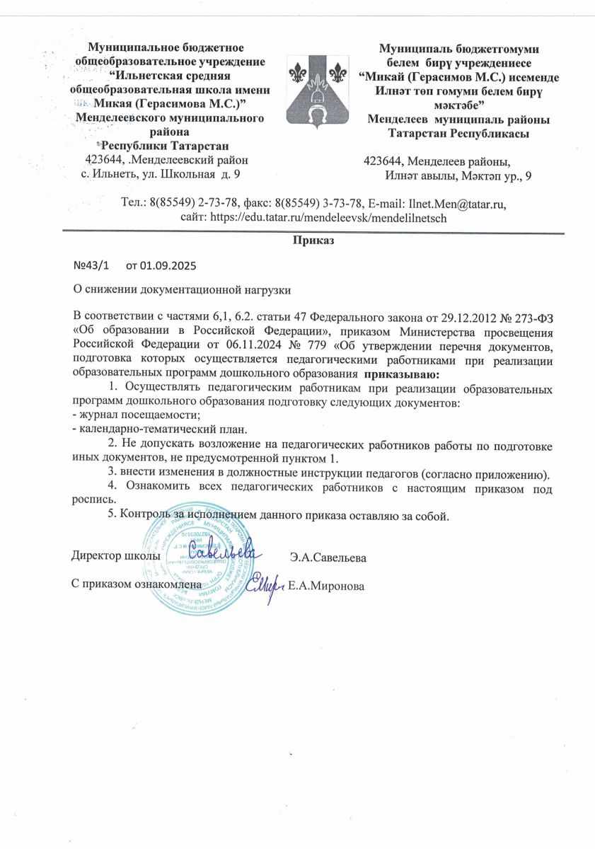 муниципальное бюджетное общеобразовательное учреждение "Ильнетская средняя общеобразовательная школа имени Микая (Герасимова М.С.)" Менделеевского муниципального района Республики Татарстан