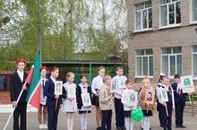 Торжетсвенная линейка с поднятием флага РФ и исполнение гимна РФ,РТ и Менделеевского района.