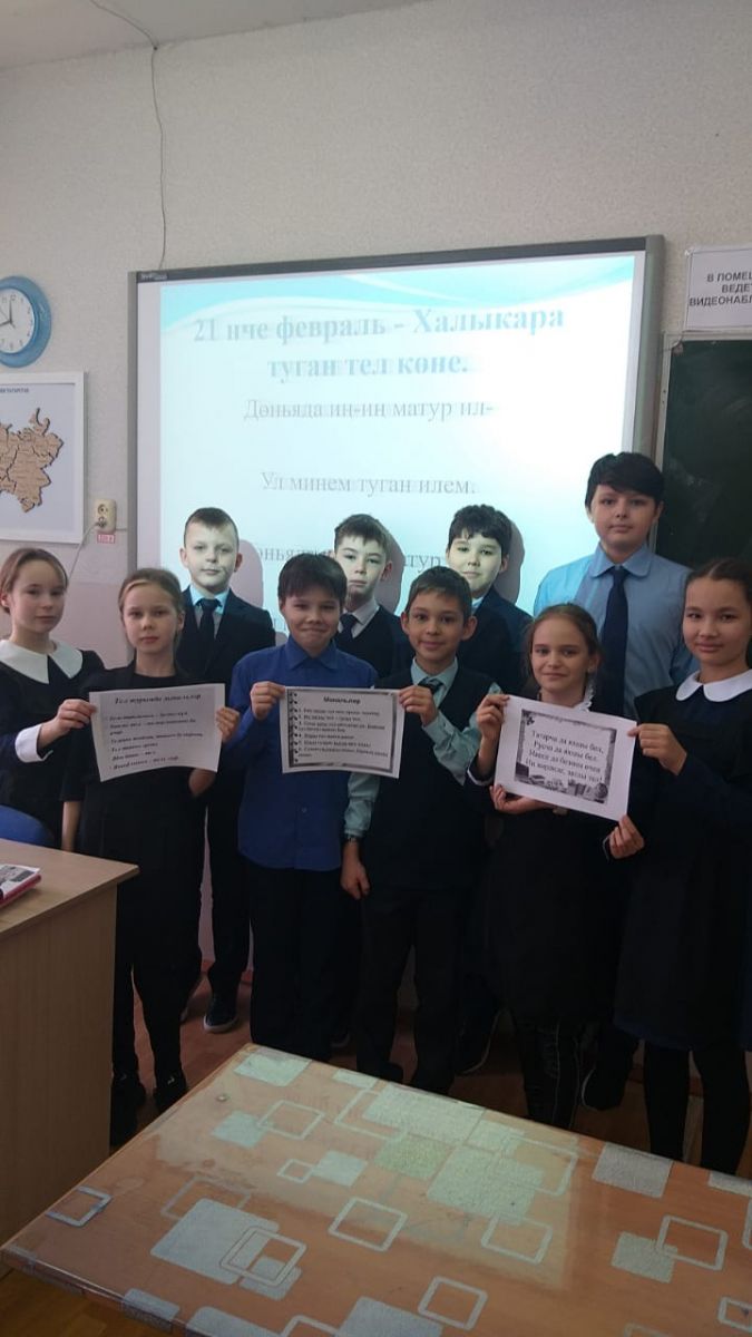 Учитель родного языка и литературы Ганиева А.С. провела для 3в и 3д классов интеллектуальную игру акыл-батл «Тапкырлар». Команды отвечали на вопросы разные по тематике, сопоставляли портреты поэтов, композиторов и художников со сферой их деятельности. Гиззатуллина Н.Х. провела для учащихся 4-х классов викторину «Туган җирем Татарстан», а также ребятам была продемонстрирована презентация. Садыкова А.Н. провела марафон для 5а класса «Телләр белгән, илләр гизгән». Ребята узнали интересные факты о языках народов, расширили свой кругозор. Смирнова Г.Р. для учащихся 4г, 5а, 5г классов провела тематические часы «Туган телем». Учащиеся подготовили рисунки, выпустили стенгазету с интересными фактами и заданиями, выбрали лучшие тетради для выставки, выучили стихотворения о родном русском и татарском языке.