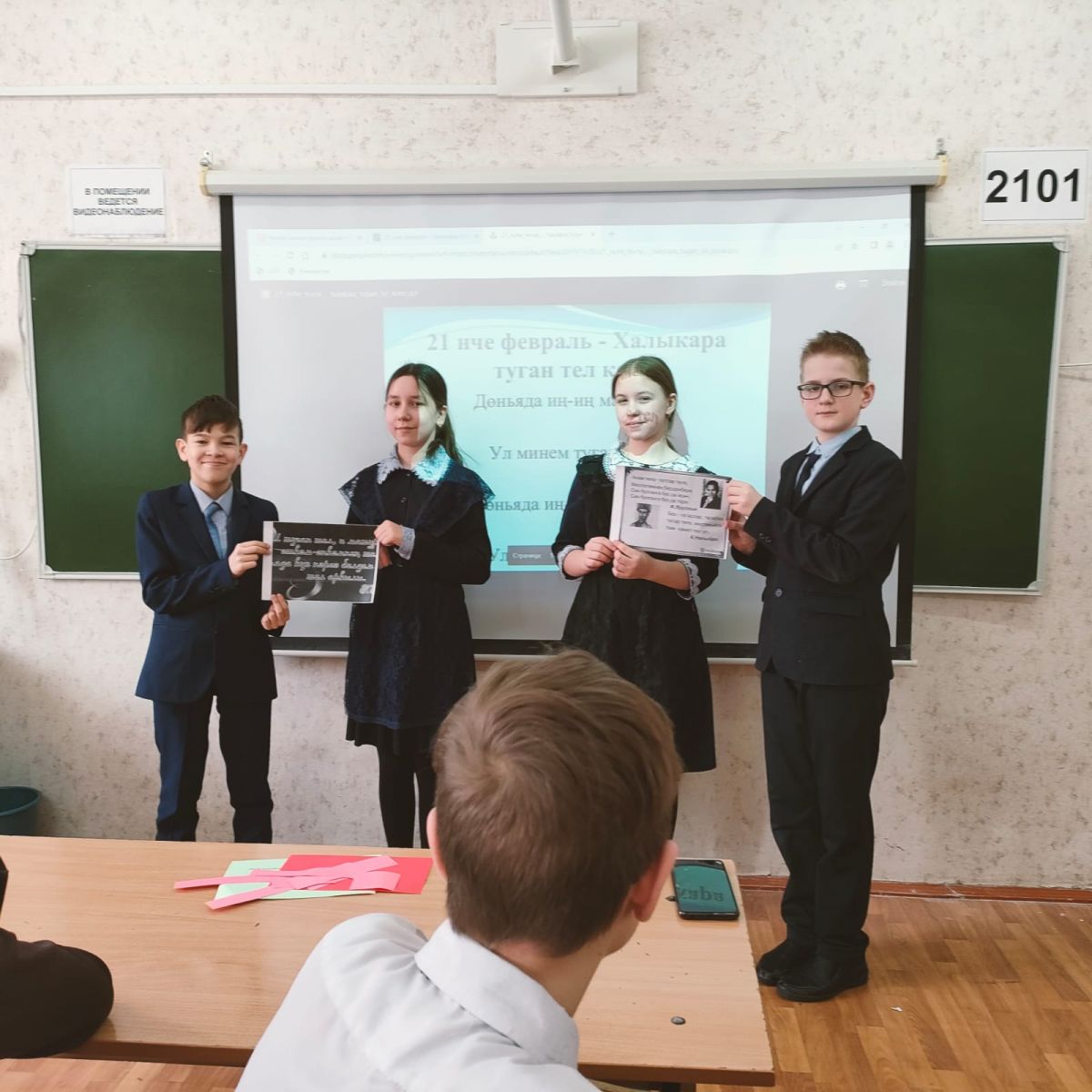 Туган тел һәм әдәбият укытучысы Ганиева А.С. 3в һәм 3д сыйныфлары өчен акыл-батл «Тапкырлар»интеллектуаль уенын үткәрде. Командалар төрле темалар буенча сорауларга җавап бирделәр, шагыйрьләр, композиторлар һәм рәссамнар портретларын аларның эшчәнлек өлкәсе белән туры китерделәр. Гыйззәтуллина Н.Х. 4нче сыйныф укучылары өчен «Туган җирем Татарстан» викторинасын үткәрде, шулай ук балаларга презентация күрсәтелде. Садыйкова А.Н. 5а сыйныф укучылары белән «Телләр белгән, илләр гизгән» марафонын үткәрде. Балалар халыкларның телләре турында кызыклы фактлар белделәр. Смирнова Г.Р. 4г, 5а, 5г сыйныф укучылары өчен «Туган телем» тематик сәгатьләре үткәрде. Укучылар рәсемнәр әзерләделәр, кызыклы фактлар һәм биремнәр белән стена газетасы чыгардылар, күргәзмә өчен иң яхшы дәфтәрләрне сайладылар, туган рус һәм татар теле турында шигырьләр сөйләделәр.