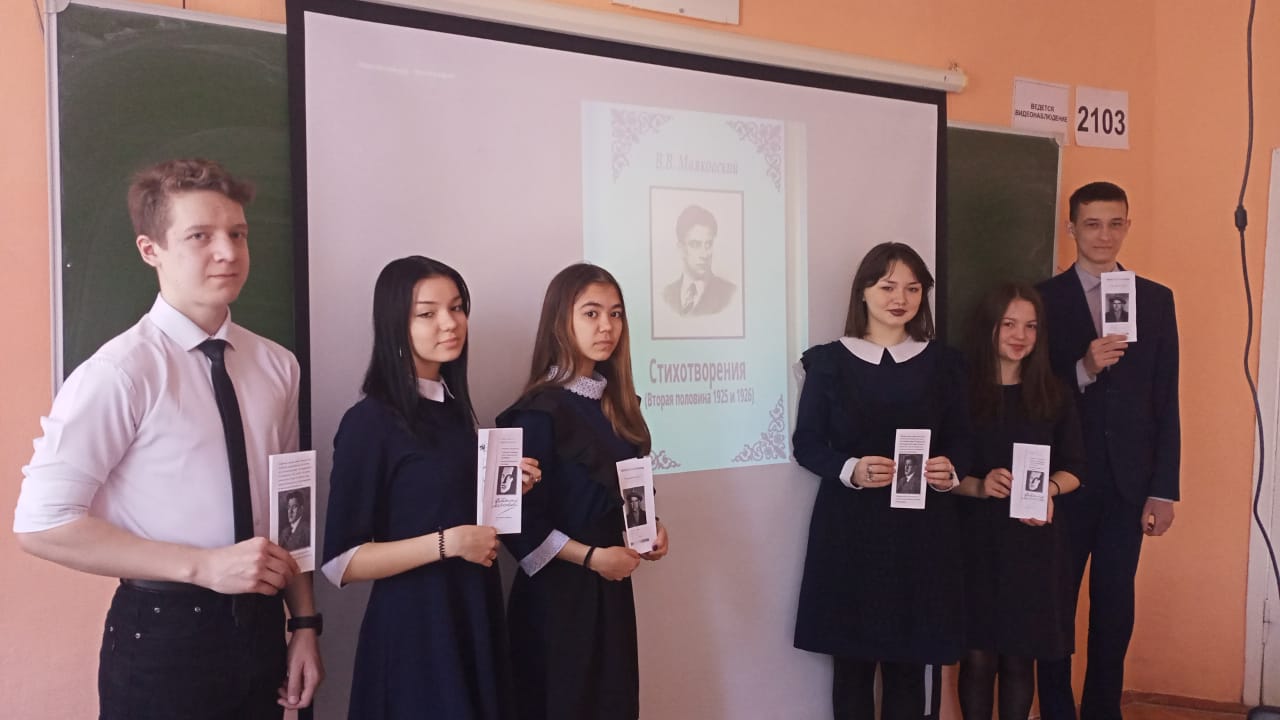 Рус теле һәм әдәбияты атналыгы кысаларында 10-15 апрельдә лирик-новатор, XX гасыр шигъри авангарды лидеры Владимир Маяковскийның 130 еллыгына багышланган чаралар узды. 5-11 сыйныф укучылары в.Маяковскийның тормышы һәм иҗаты турында презентацияләр әзерләделәр, шигырьләр сөйләделәр, рәсемнәр һәм шигырьләр конкурсында катнаштылар, В. В. Маяковскийның «Необычное приключение, бывшее с Владимиром Маяковским летом на даче» әсәрен сәхнәләштерделәр, шагыйрь иҗаты буенча әдәби викторина сорауларына җавап бирделәр, стена газеталары чыгардылар.